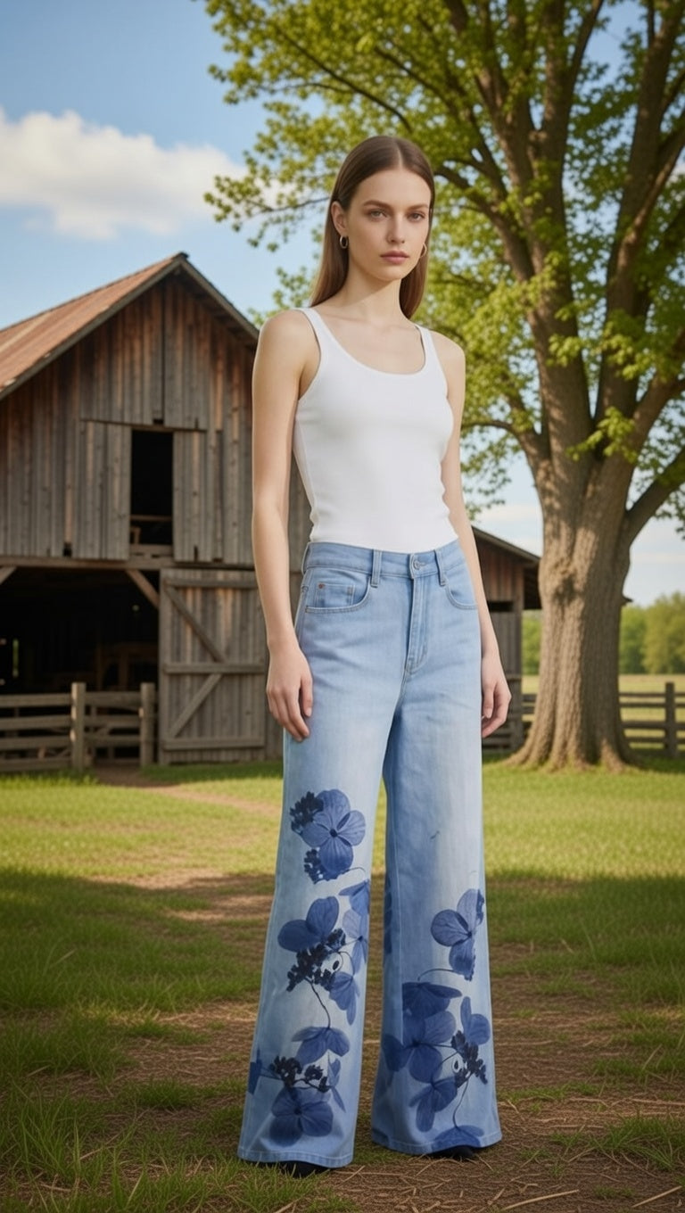 המכנסיים הם ג'ינס רחב רגליים בגזרה גבוהה בצבע כחול בהיר שטוף, עם הדפס פרחי הורטנזיה כחולים גדולים ואמנותיים בחלק התחתון של הרגליים.