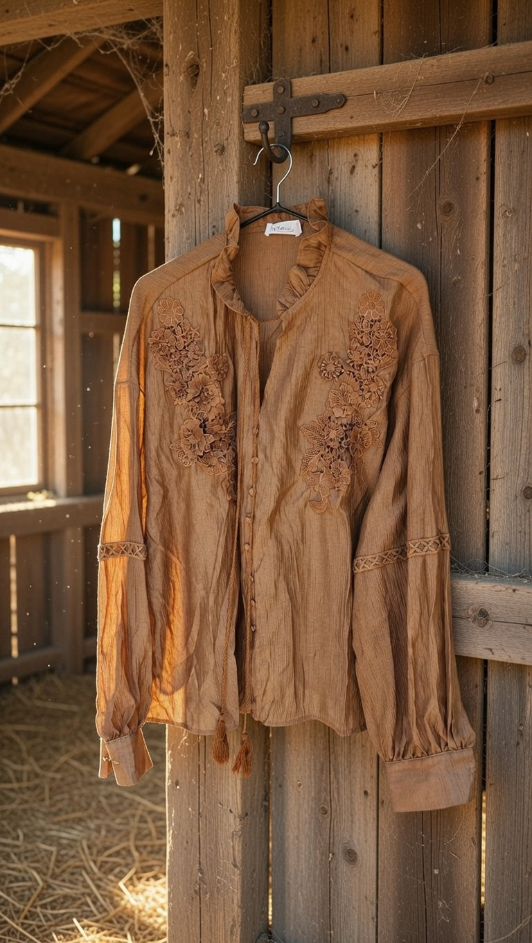 חולצה שקופה עדינה בצבע חום-טאופ (חום-חולי) בגזרה וינטג'ית, עם שרוולים ארוכים, צווארון פרוע קטן, כפתורים מלפנים ותחרה פרחונית יפהפייה תפורה על החזה והכתפיים. מראה בוהמייני-רומנטי, קליל ומעט שכבות