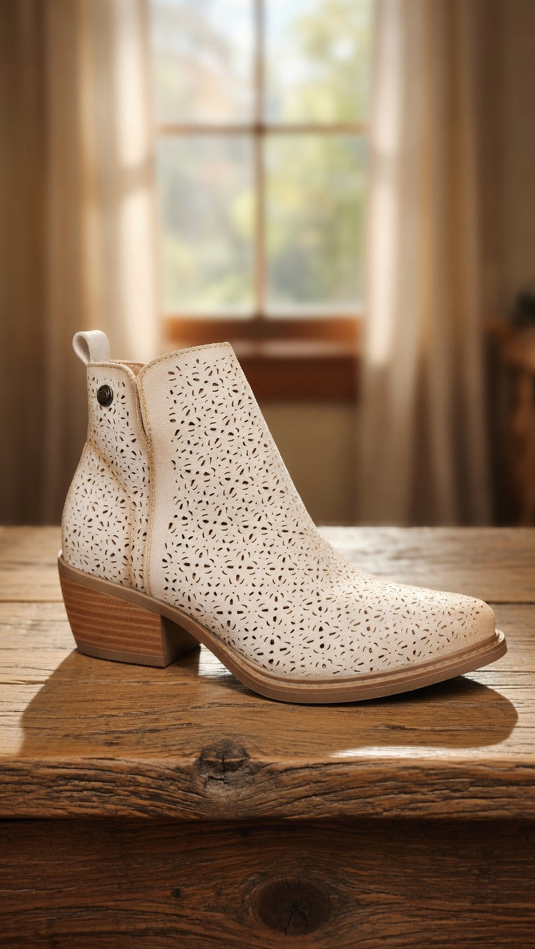 מגפון בגוון שמנת עם חיתוכי לייזר עדינים, עקב נמוך ומראה אלגנטי ואוורירי.