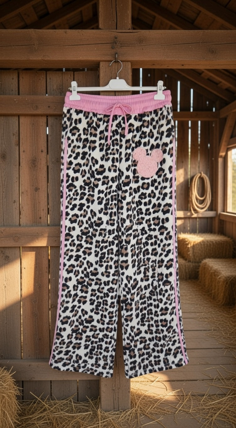 שרוך ורוד, פסי צד ורודים עדינים, וכיס מרובע עם אפליקציה תלת-ממדית של ראש מיקי מאוס ורוד פאפי וחמוד במיוחד.