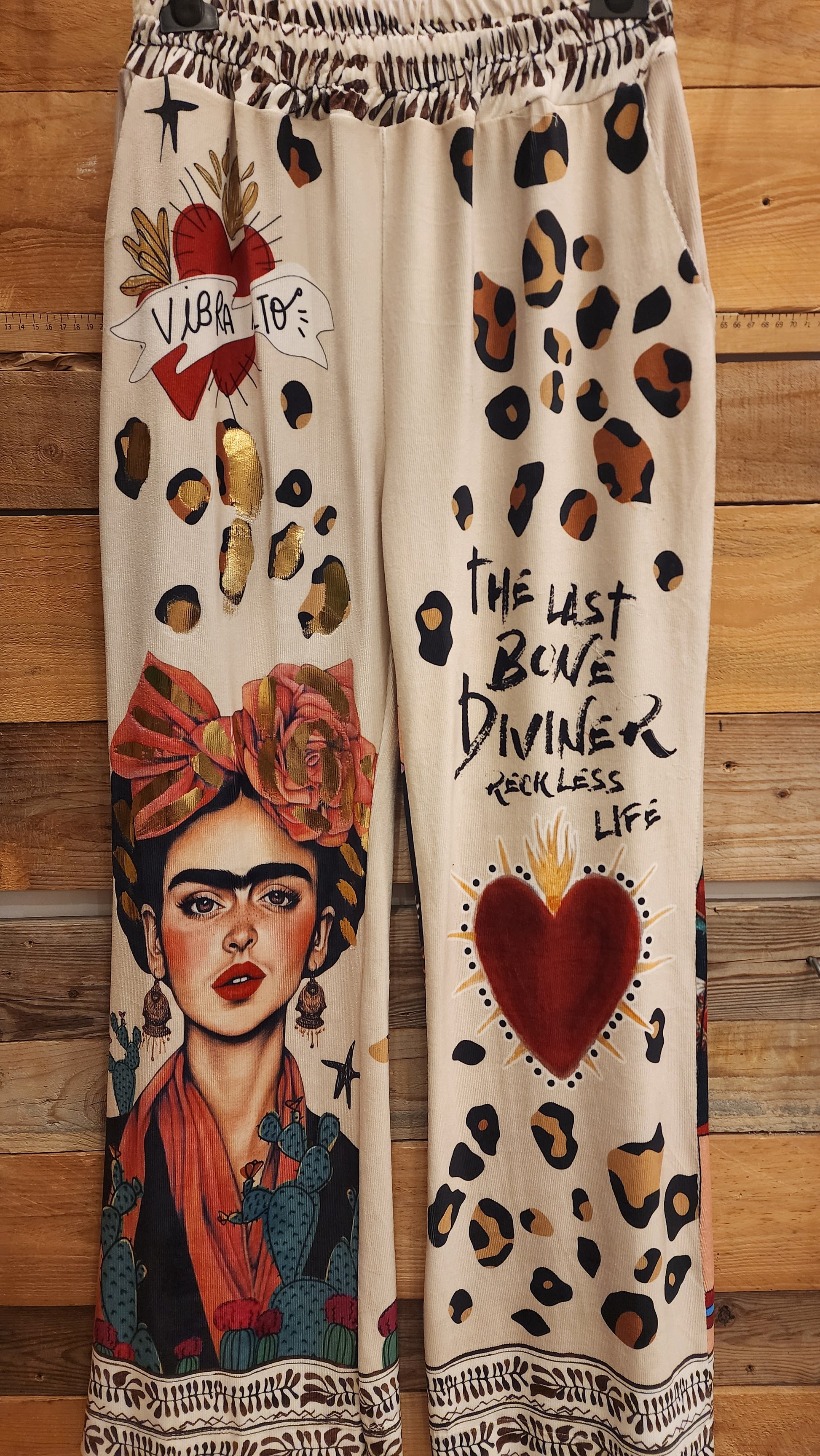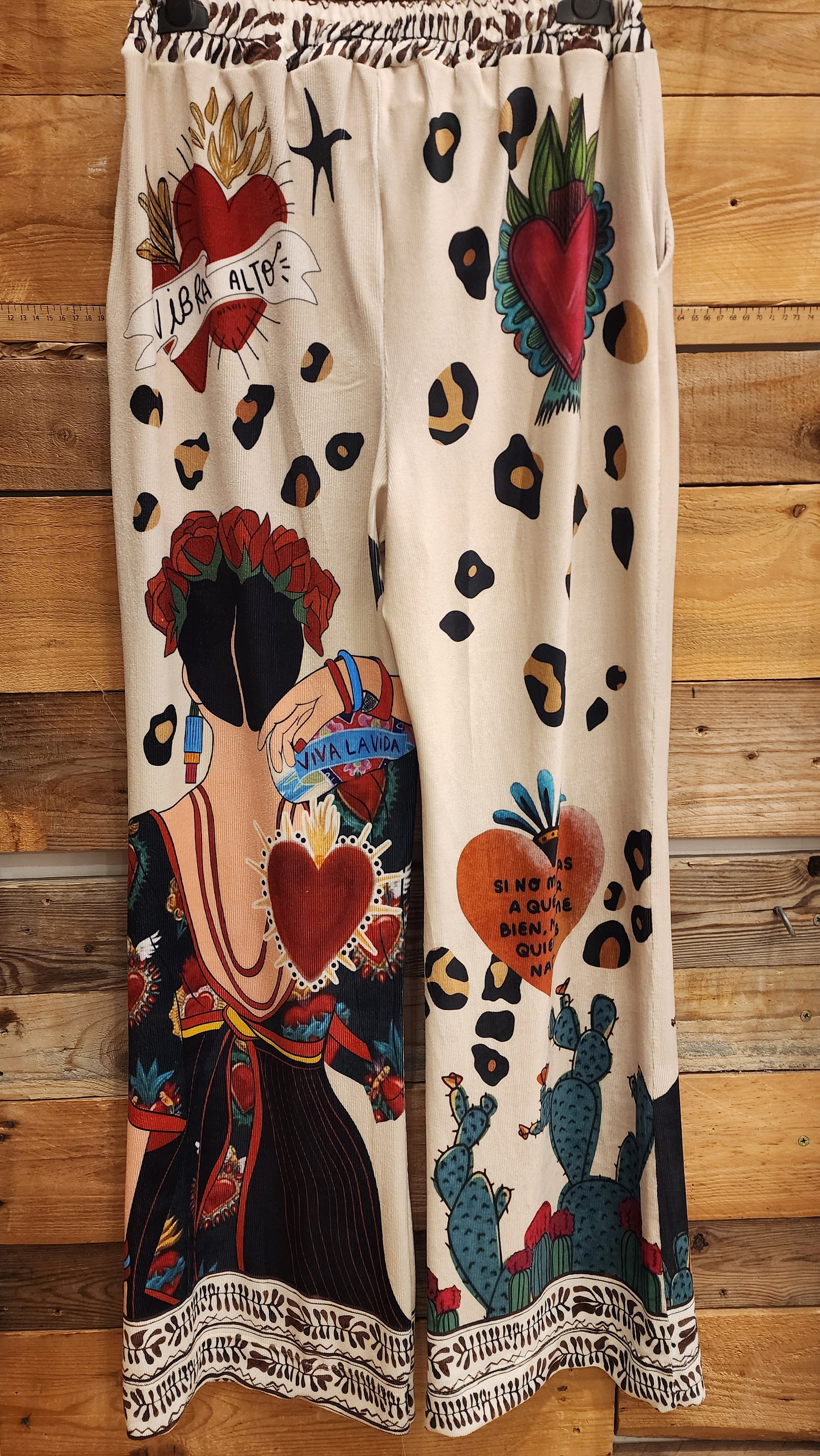 מכנסיים צבעוניים ובולטים בעיצוב ייחודי ובוהמייני, עם הדפס מנומר משולב באלמנטים של לבבות, כיתובים אמנותיים ודמות המזכירה את פרידה קאלו. גזרה רחבה ונוחה, חגורת גומי מודפסת, ובסיס בד בגוון בהיר עם נגיעות זהב למראה אקלקטי ונועז.